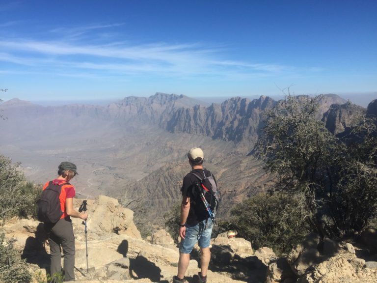 Transfert vers le départ de la randonnée : 30 minutes maximum. Descente du Jebel Akhdar par le sentier dominant le Wadi Qishu, un des plus spectaculaires du massif.