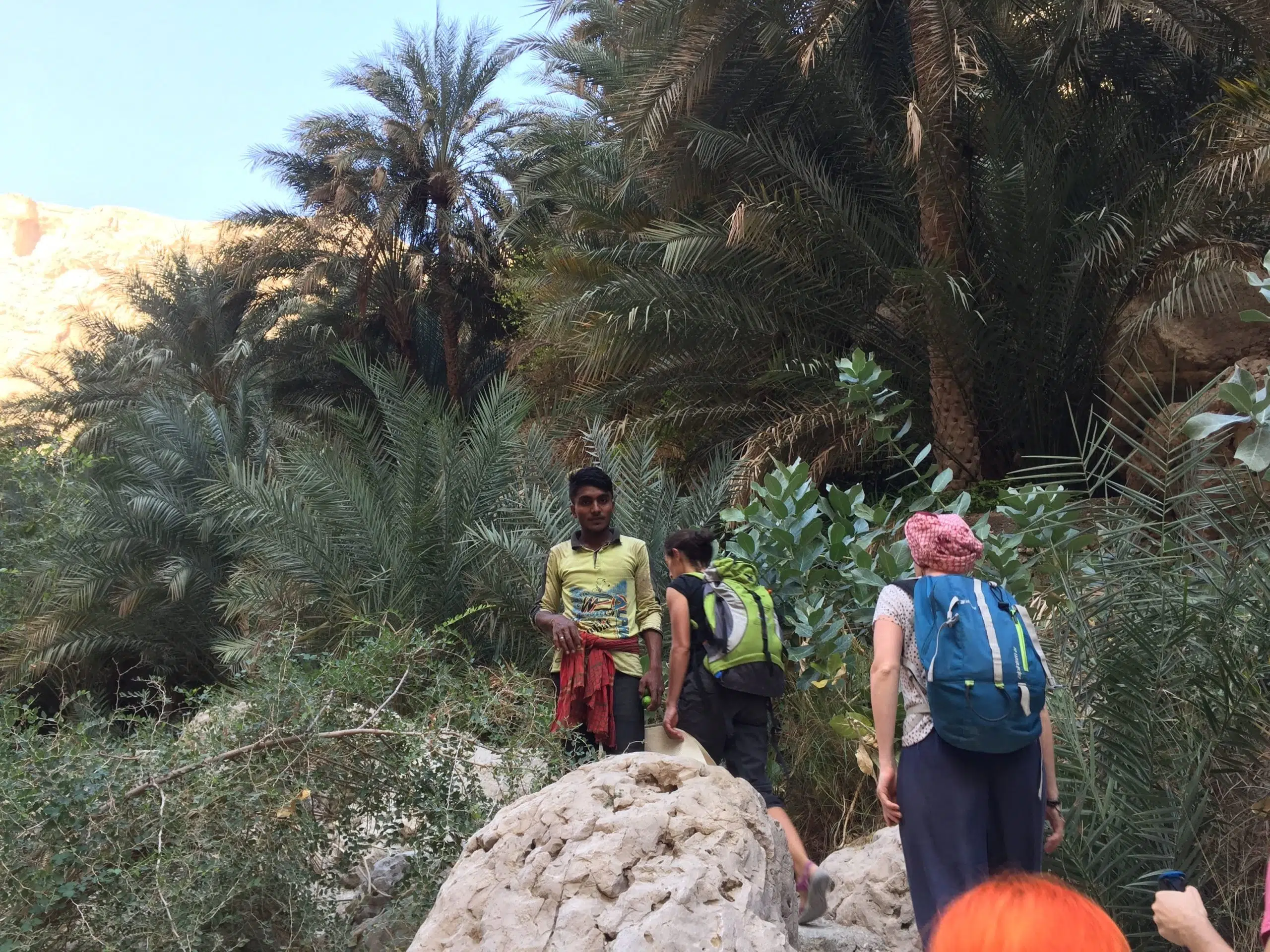 Après une petite traversée du plateau, nous atteignons un col qui nous offre un point de vue sur l'imposant Wadi Bani Kharus, un des plus gros wadis du massif parsemé de villages et de palmeraies. Grande descente au fond de ce wadi.
