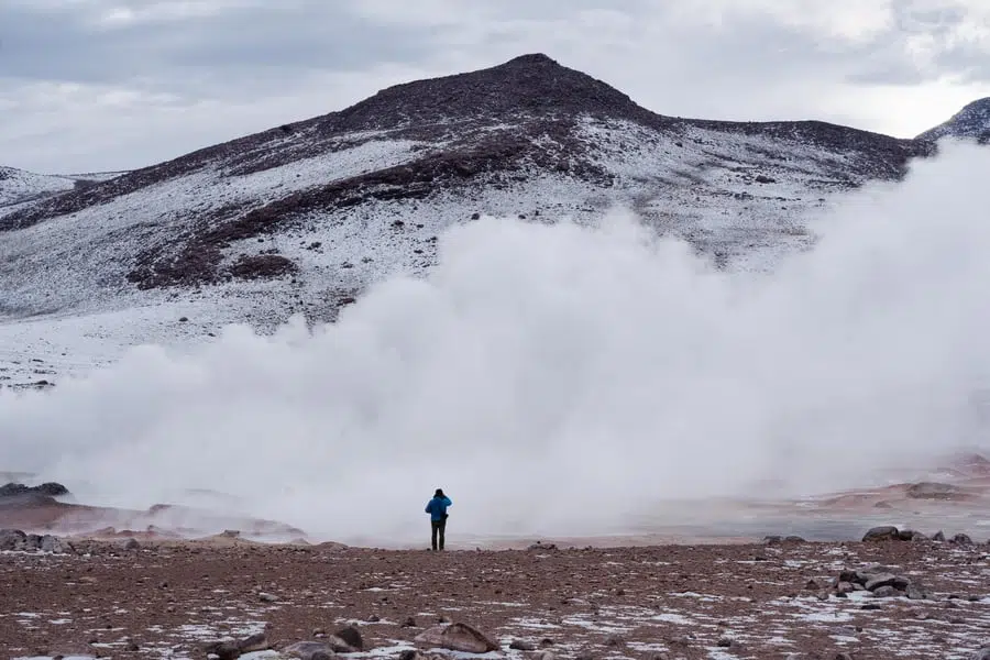 Cap au sud pour rejoindre la laguna Colorada. Puis excursion aux geysers Sol de Mañana (4 850 m d'altitude). Nous faisons halte aux thermes de Polques avant de longer la Laguna Salada et de traverser le désert de Dali. Nous parvenons en fin de matinée à la Laguna Blanca et à la Laguna Verde, au pied des volcans Juriques et Licancabur (5 960 m d'altitude). Retour à la Laguna Colorada en fin d'après-midi.