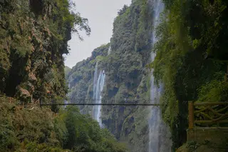 Visite des gorges de Xianghuoyan, promenade entre les étroites falaises, découverte des grottes et des cascades. Nuit à Shuitouzhai.